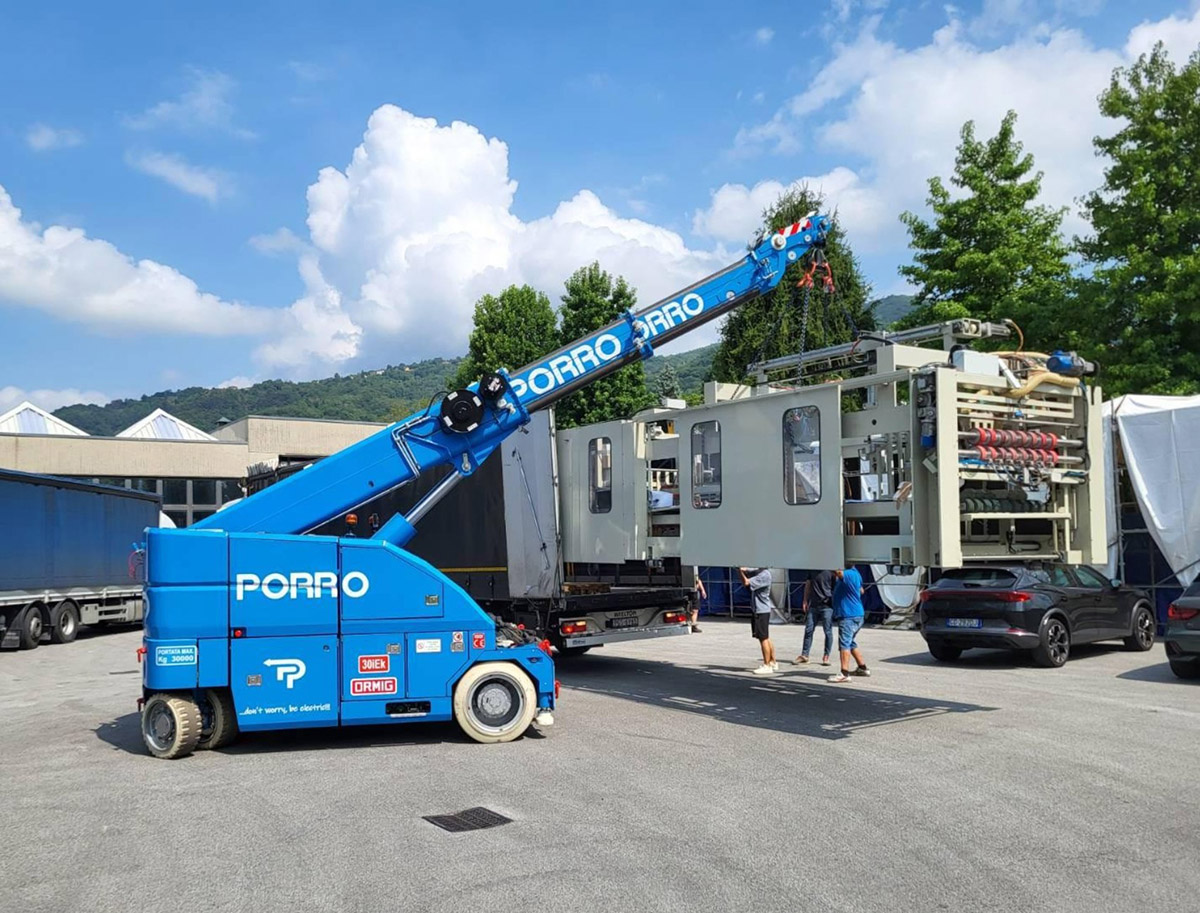 La gamma di gru elettriche attuale è caratterizzata da dimensioni particolarmente contenute, con larghezze massime tra 184 cm e 244 cm. Sempre mantenendo quattro punti di appoggio al suolo hanno inoltre la capacità di ruotare su sé stesse, a compasso, così da avere raggio di sterzo minimo possibile e grande agilità negli interni.